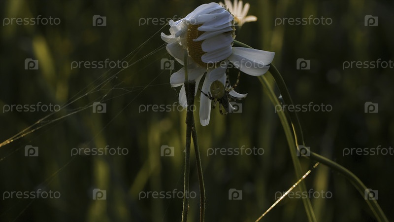 Закрытие паука на Дейзи.Креативное.Прекрасный паук сидит на летнем цвету в солнечный день.Паук с паутиной на цвете.Макрокосм летнего луга