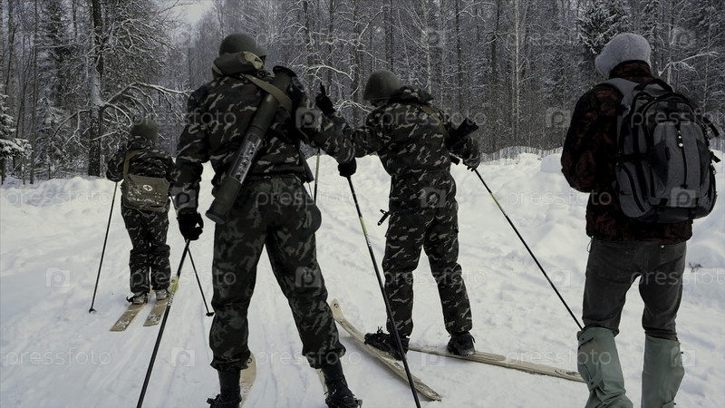 Группа солдат, катающихся на лыжах в лесу с оружием. Солдаты с автоматами АК-47 и гранатометами бегают по зимнему лесу на лыжах. Солдаты тренируются в лесу зимой. Зимняя война и военная концепция