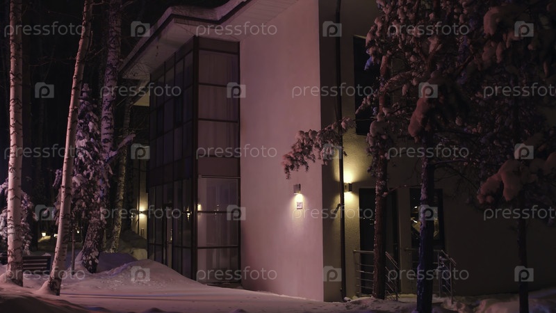 Фасад большого дома поздним зимним вечером освещается красочным мигающим светом аварийной машины. резервные кадры. вид на дачу в снежную зиму ночью
