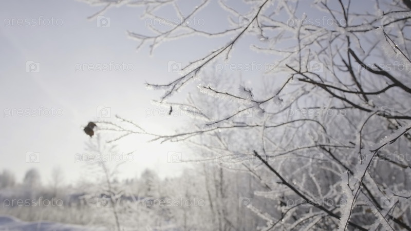 Ветка покрыта снегом в холодный зимний день.Креативно.Покройте зимнее дерево под чистым голубым небом