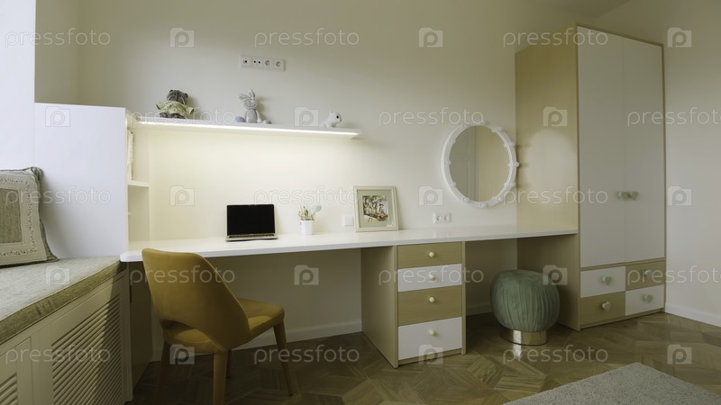 Просторная белая комната с рабочим пространством. креативность. ярко освещенный номер с коричневым креслом и ноутбуком, украшенные игрушками и висящим зеркалом, а шкафы видны поблизости