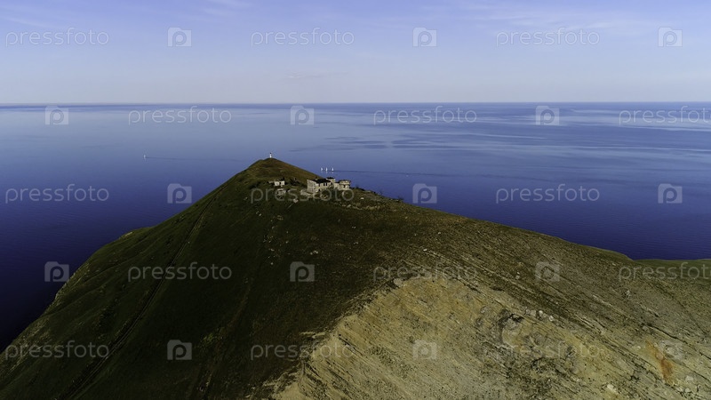Большой холм над морем. Стрельба. Огромная высокая гора, на которой расположены жилые здания, которая находится выше высоты спокойного, тихого моря