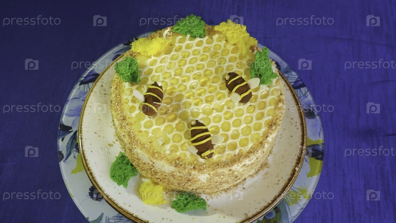 Красивый медовый торт, украшенный сливочными пчелами