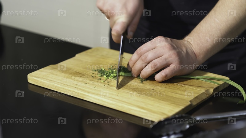 Повар разрезает лук. Искусство. Мужчина на кухне режет белый лук в полукольца с помощью ножа. Рядом с доской находится лапша и мешок розмарина