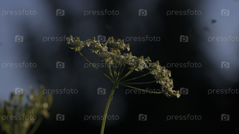 Естественный фон с крошечными комарами, летающими над растущими растениями