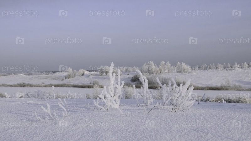 Зимний пейзаж с морозными кустами в солнечное утро, спокойная зимняя природа под солнечным светом