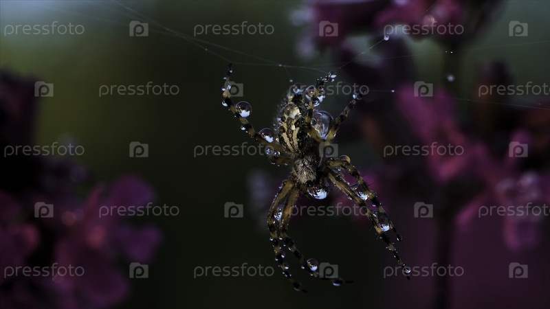 Закройте вид на красивую утреннюю росу в паутине и маленького насекомого.Креативно.Паутины и зеленые дикие растения с лиловыми цветами