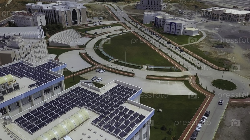 Квадрокоптер летает над отелями.Клип.Вид на шоссе, который проходит мимо строительных отелей с солнечной энергией