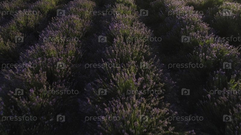 Вид с воздуха рядов фиолетовой лаванды в цветущем поле во время захода солнца, цветковый фон. Стрельба. Впечатляющие лиловые цветы растут на бочках большого красивого поля