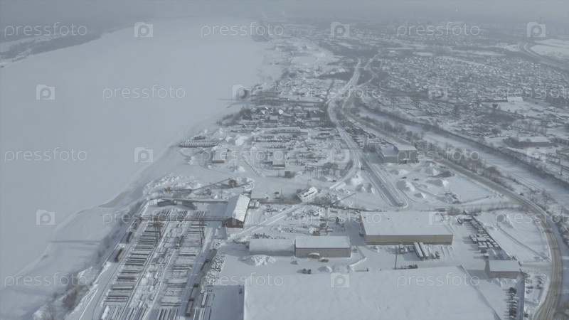 Вид с воздуха на городские дома и реку зимой, зимний пейзаж города. Клип. Заснеженный город в утреннем тумане