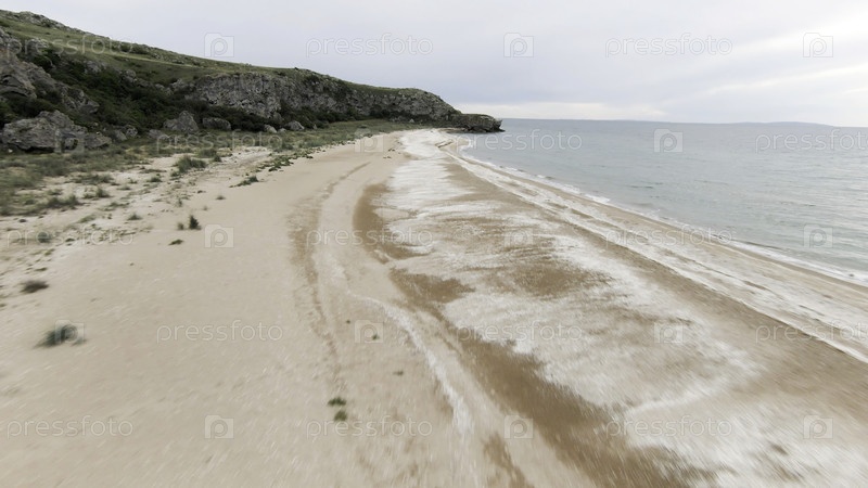 Вид на красивый пляж с морем и песком, за которым растительность, зеленые поля и деревья