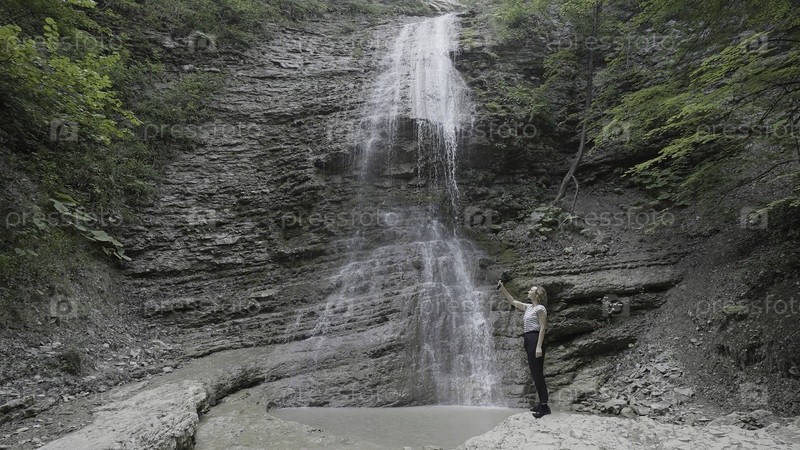 Женщина делает фотографии или видео гор и водопада на своем смартфоне с помощью штатива. Продолжайте. Женская путешественница со селфи-палочкой и телефоном стоит в ущелье, окруженное зелеными склонами скал и водопадом