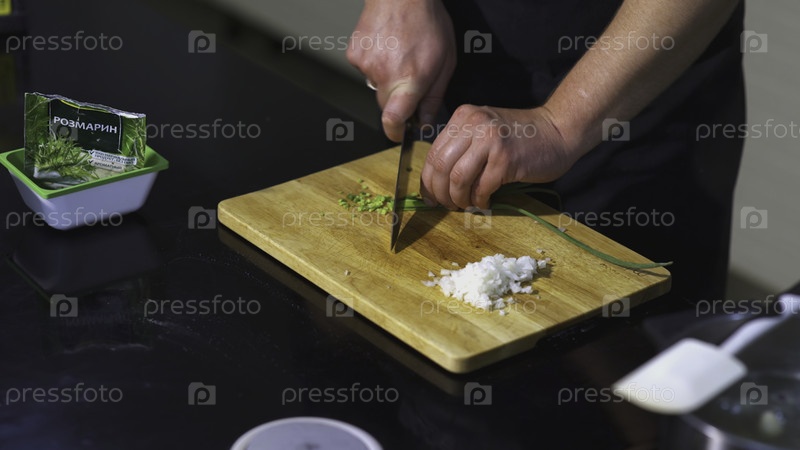 Повар разрезает зеленый лук. Искусство. Руки мужчин в раме режут зелёный лук ножом на доске. На столе есть доска, лук, розмарин и лапша