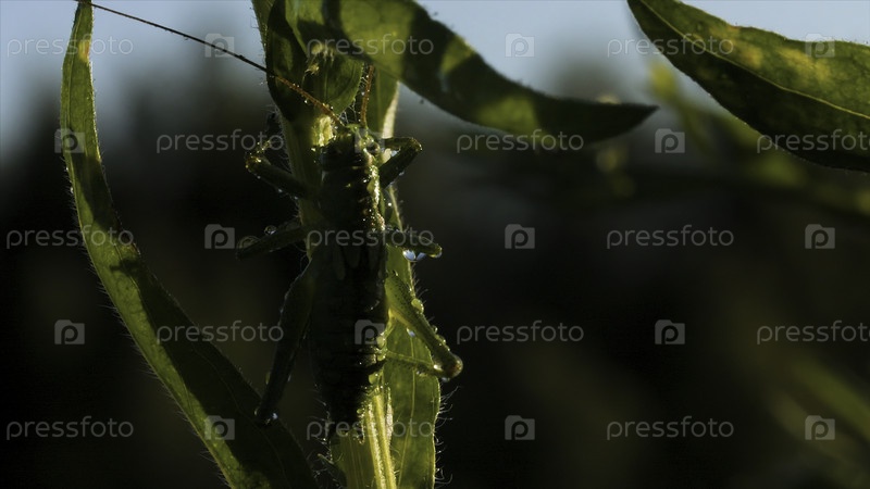 Закройте большого зеленого жука, сидящего на стебле зелёного растения.Креативно.Насекомое в травяных полях, летняя природа