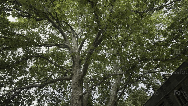 Прогулка под летним деревом. Идите дальше. Ниже виден ствол и большие ветви с пышными зелеными листьями на фоне облачного неба