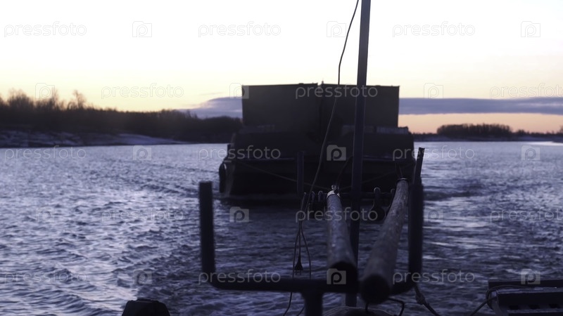 Части грузового судна. Клип. Большое судно с прицепом, которое движется в развивающихся волнах вдоль реки и несет груз темным вечером с красивым закатом солнца и фиолетовым фоном. Высококачественный персонал FullHD