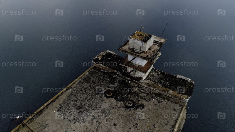Снимок из воздуха старого ржавого пирса в бирюзовом темном океане.Стрельба.Летать над старым заброшенным пиром в солнечный летний день