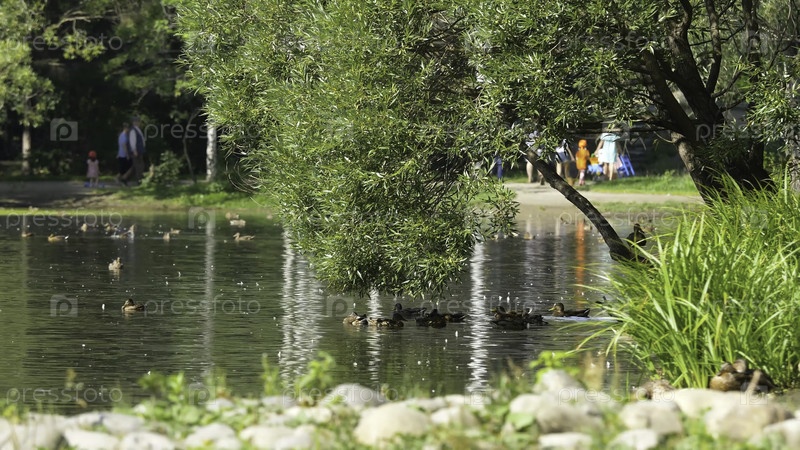 Дикие гуси плавают в реке в солнечный день в тихом парке, летающие утки - в пруду