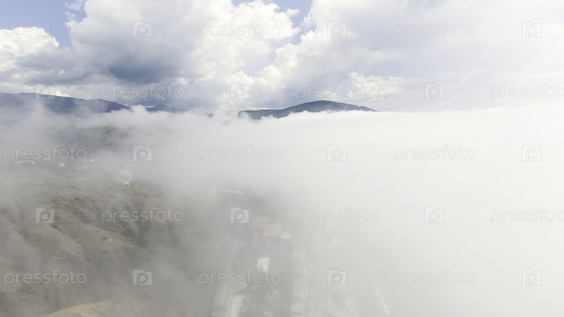 Вид сверху на плотные облака в небе с горными вершинами. Идите дальше. Летать над белыми облаками на фоне горизонта неба с горой. Панорама пасмурного неба и горизонта с вершиной горы