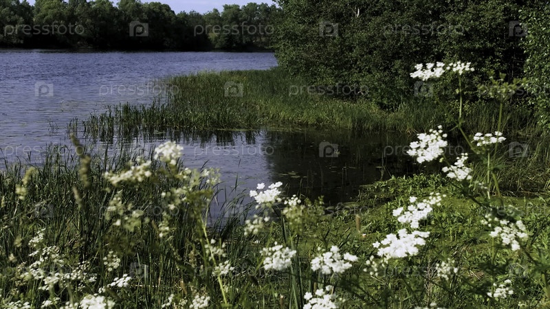 Зеленый летний солнечный пейзаж.Креативный.Небольшой кусок озера, заросшего белыми цветами в кругу, на котором дует ветер и видны зеленые кустарники и деревья
