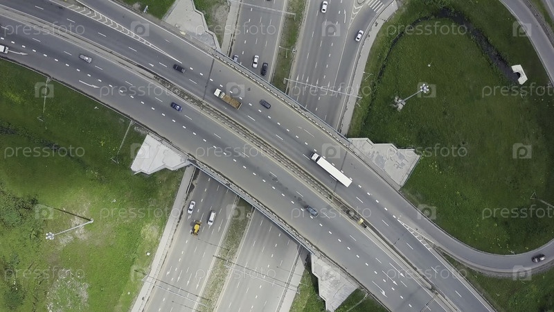 Высокая скоростная дорога. Клип. Вид сверху на повороты и линии городской автомагистрали. Кривая подвесного моста. Справочная живописная дорога