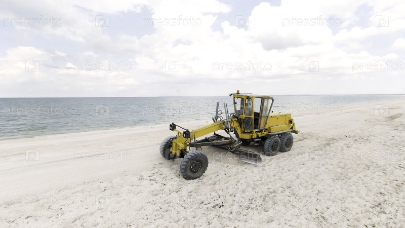Вид на трактор на пляже. Идите дальше. Бульдозер очищает белый пляж от моря. Булдозер убирает мусор или уровень пляжа в море