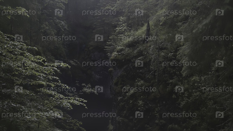 Воздух человека, стоящего в ущелье между двумя горами, покрытыми зелеными растениями и деревьями - экстремальная обстановка