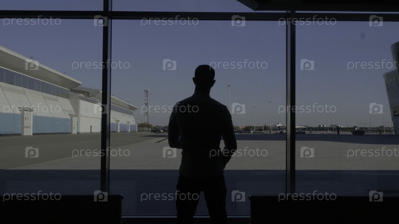 Силуэт бизнесмена сзади, который смотрит на парковочное место за окном. HDR. Сзади молодой человек стоит перед панорамным окном в деловом центре