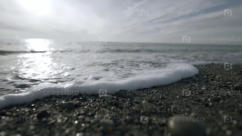 Маленькая волна катится по кругу. идите вперед. небольшая волна катится на каменном берегу. гладкий скалистый берег с спокойной волной в солнечный день