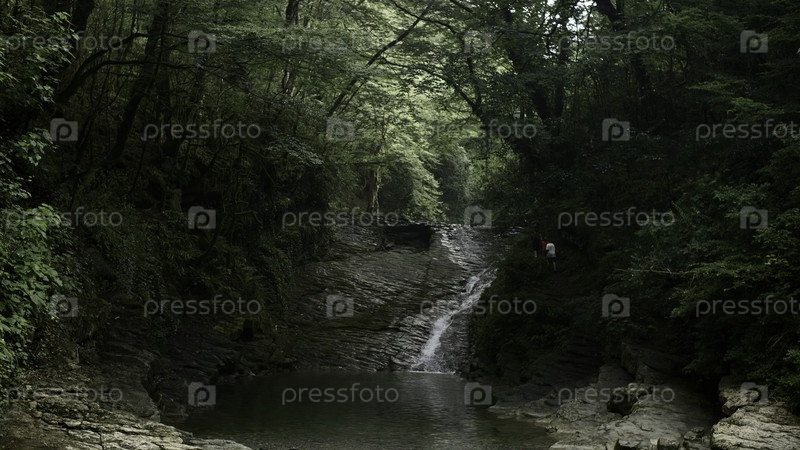 Зеленые джунгли и небольшое озеро в летний день.Креативно.Горный холодный ручей течет по скалистому склону