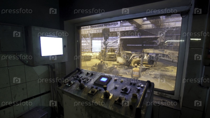 Центральный диспетчерский завод тяжелой промышленности. резервные кадры. фрагмент операционной с мониторами и окном с людьми, работающими в мастерской