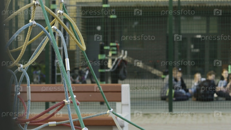 Современная игровая площадка с подростками. Резервные кадры. Современная зона отдыха вблизи жилого комплекса. Дети отдыхают на игровой площадке с красивыми качелями. Пейзаж жилого комплекса с зоной отдыха