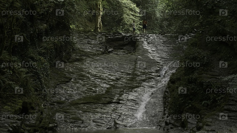Зеленые джунгли и небольшое озеро в летний день.Креативно.Горный холодный ручей течет по скалистому склону