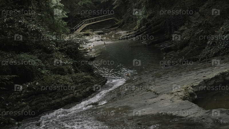 Природный дикий фон с горной рекой и ручкой среди скал. творческий. небольшой пруд в ущелье, концепция летнего туризма