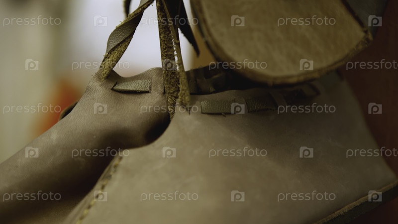 Бутылки из коричневой кожи повесили на ярмарке. Искусство. Ручная кожаная обувь крупный план. Винтажные кожаные туфли, продаваемые на ярмарке