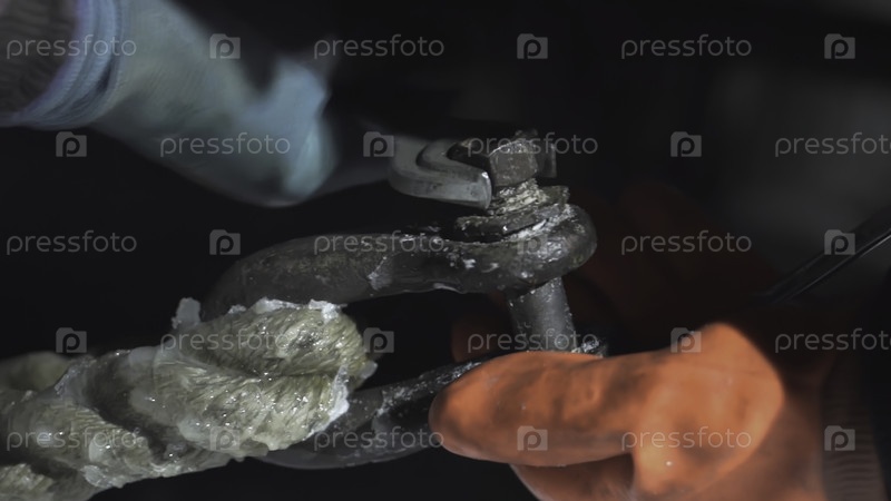 Мужские руки в оранжевых перчатках на борту корабля затягивают винт с якоря судна ночью