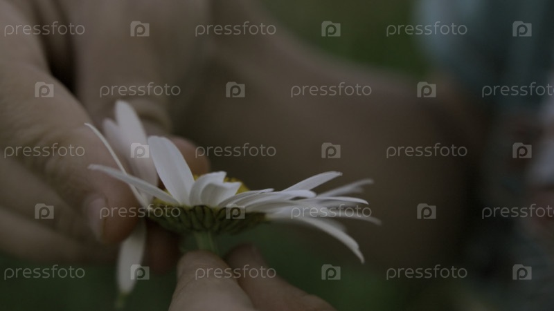 Девочка или мальчик собирает листья ромашки на зеленом размытом фоне, закрывается.Креативно.Удача говорит о традиции