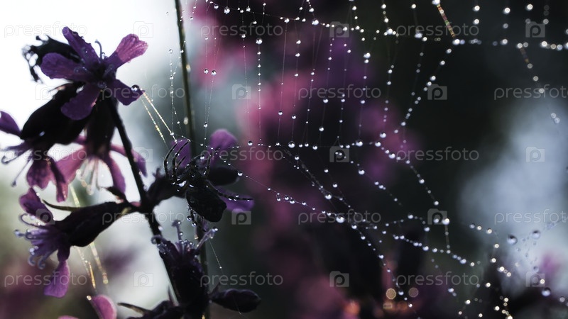 Маленький паук сидит на своей паутине рядом с фиолетовой маленькой орхидеей