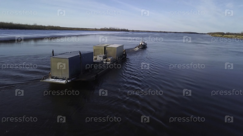 Контейнерная баржа плывет вдоль широкой красивой реки на закате.Концепция транспорта, вид с воздуха