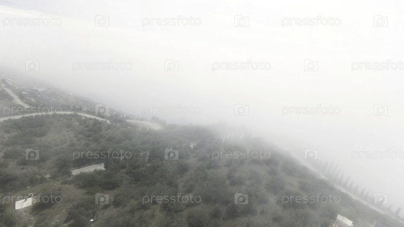 Вид с воздуха на холмистую зеленую зону с густым туманом над головой. идите дальше. туман, облака и горы, красота природы