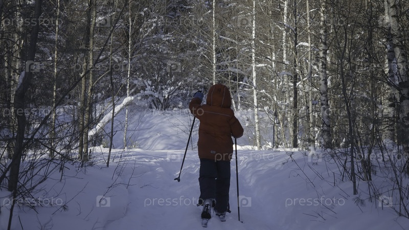 Горные лыжи через зимний лес.Креативность.Разгляд сзади ребенка, катающегося на лыжах в лесу зимнего дня, концепция здравоохранения и активный образ жизни