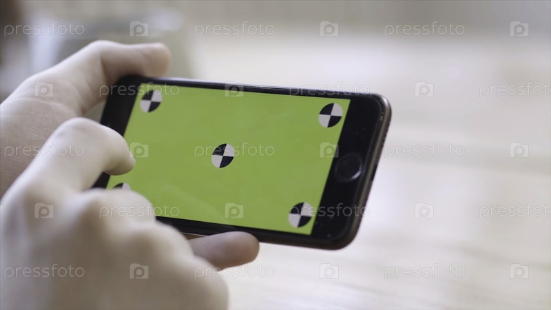 Экран с хромированной клавиатурой для размещения собственного контента. резервные записи. Женская рука с идеальным маникюром держит смартфон и скользит по зеленому экрану цветной клавишей