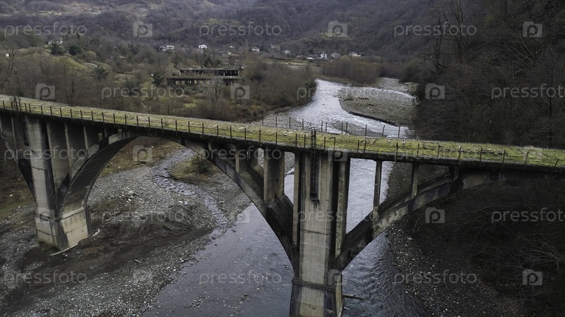 Старый заброшенный каменный мост через холодную горную реку, летящий над ржавым мостом и разрушенными зданиями возле осенних деревьев