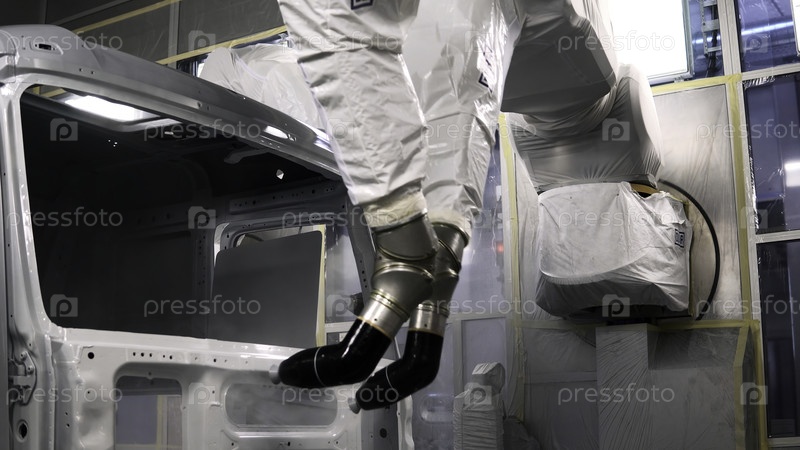 Санкт-Петербург - Россия, 12.27.2021: покраска каркаса автомобиля с помощью роботов-распылителей. Сцена. Производство машин на заводе