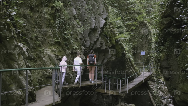Группа туристов гуляет по горам. Творчество. Несколько подростков со своими родителями решили пройтись через пещеры в каменных стенах. Люди ходят на висячих мостах вдоль камней