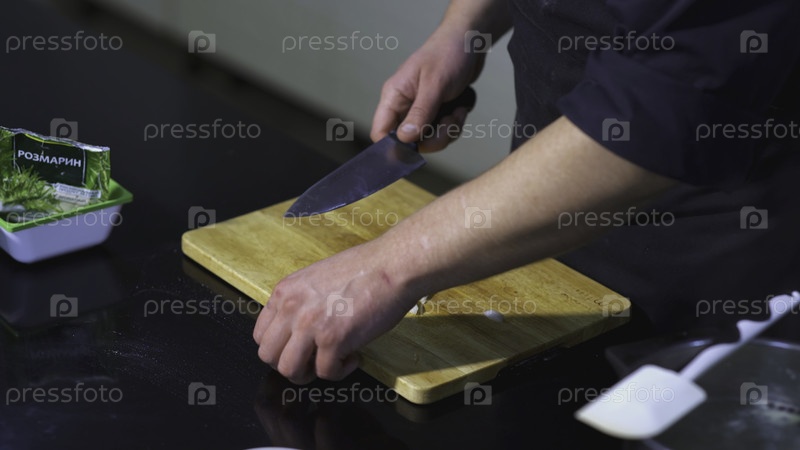 Повар разрезает лук. Искусство. Мужчина на кухне режет белый лук в полукольца с помощью ножа. Рядом с доской находится лапша и мешок розмарина