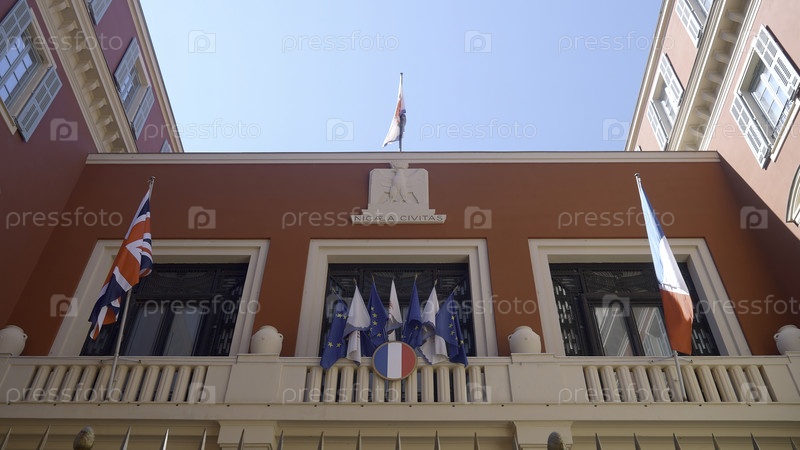 Маленькое красное здание, украшенное флагами на фоне голубого неба сверху