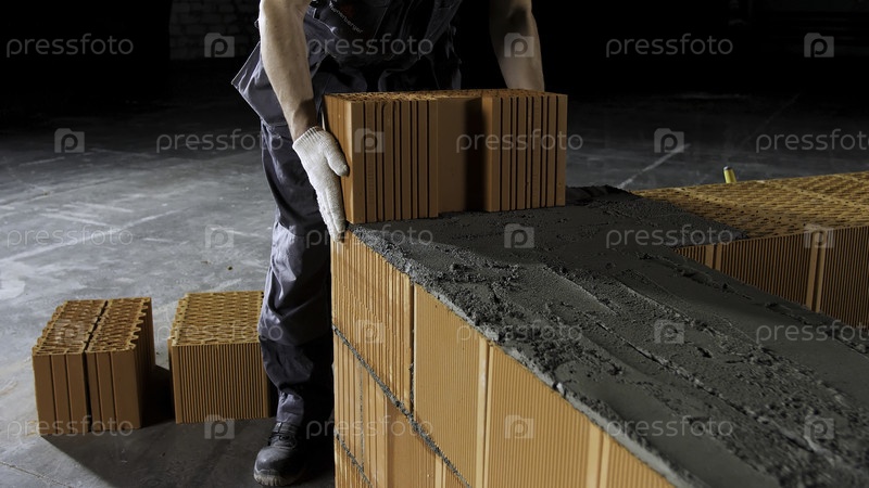 Промышленный каменщик, помещающий кирпичи на цемент при строительстве стен. покрыть человека защитными перчатками, поставив тяжелый блок кирпичей для формирования слоя