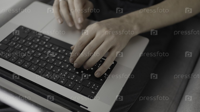 Клавиатура ноутбука. Продолжайте. Человек сидит за компьютером и работает в современных условиях, закрывает съемку клавиатуры и процесс печати
