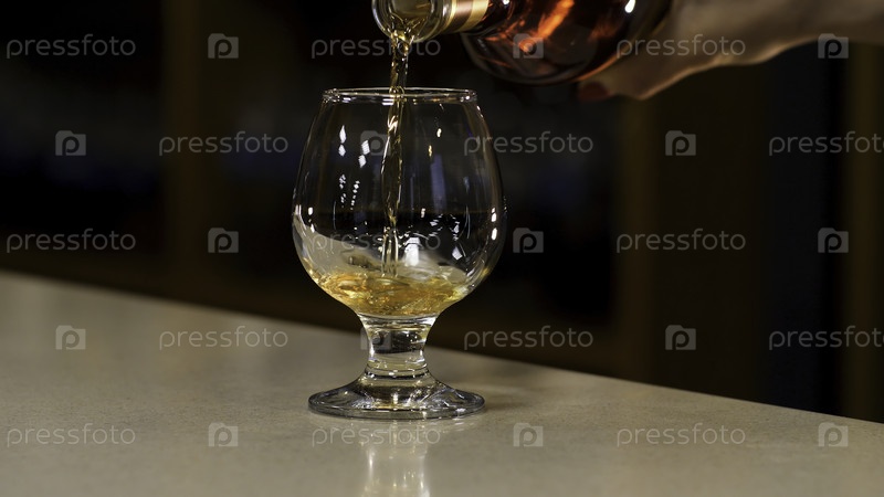 Закройте руку женщины, наливающей коньяк в стакан, стоящий на стойке бара. Резервные кадры. Рука заливает алкоголь в стакан на размытом фоне темной комнаты
